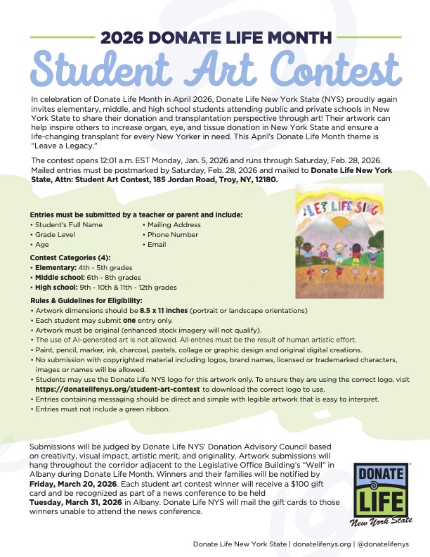 In celebration of Donate Life Month in April 2026, Donate Life New York State (NYS) proudly again invites elementary, middle, and high school students attending public and private schools in New York State to share their donation and transplantation perspective through art! Their artwork can help inspire others to increase organ, eye, and tissue donation in New York State and ensure a life-changing transplant for every New Yorker in need. This April’s Donate Life Month theme is “Leave a Legacy.”